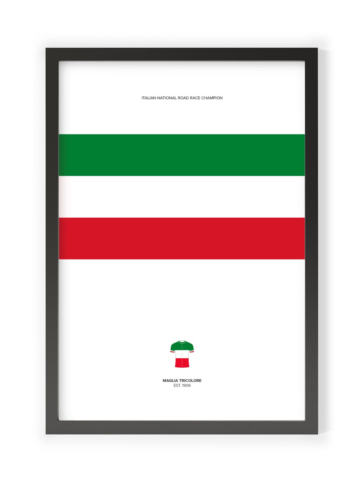 The Italian National Jersey 'MAGLIA TRICOLORE' cycling print celebrates the green, white and red bands of the Italian National Road Race Champion cycling races established in 1906.